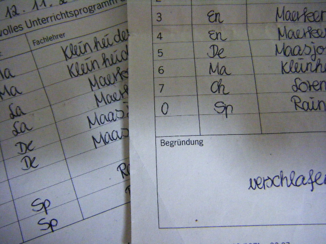 欠席した理由は一枚目が「通院」、二枚目が「寝坊」verschlafenでした……。