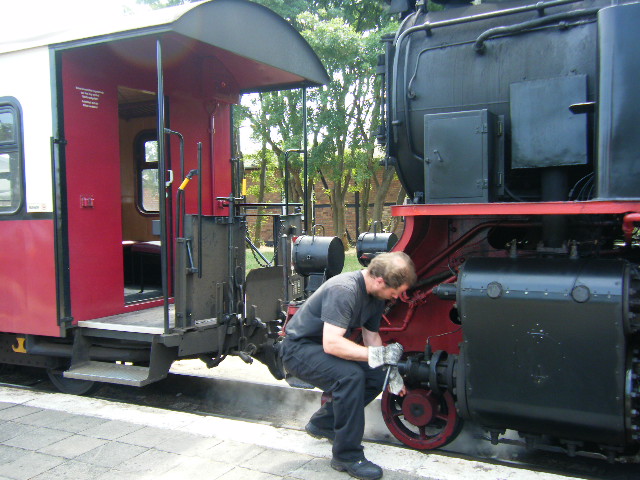 終点・キュールングスボルン・西駅でモリーのチェックをする機関士さん。