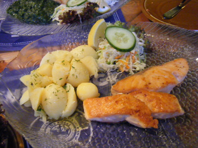 サケです。別にサラダもついていて、ボリュームたっぷりのメニュー。もちろん美味!ああもう、かつてないほどのぜいたく三昧だわ。やりたい放題、しています。