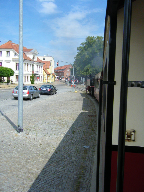 閑静な街の中、軽やかに汽笛を鳴らして駆けてゆくモリー。クルマと並行して走っていたかと思えば、次の瞬間には麦畑の間をくぐり抜けていたりする。メクレンブルクならではの自然豊かな景色。連結部から顔をのぞかせると、カーブでは機関車の黒い煙が見える!もくもく。