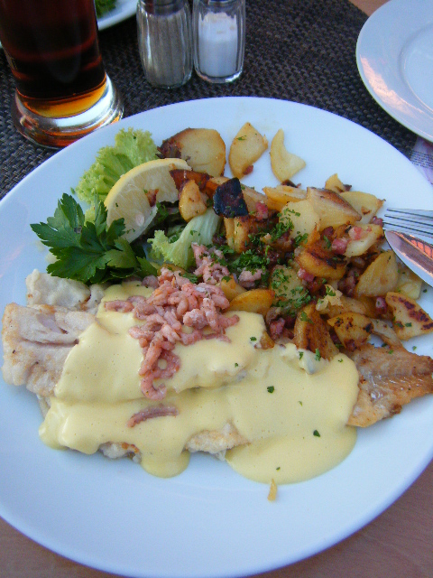 Dorsch(タラ)とNordseekrabben(北海小エビ)のオランデーズソース添え、すーっごくおいしかった!まさにゼイタクの極み。これは北ドイツで食べたお魚の中でも1、2を争うおいしさ!次にお客さまが来るときにも、絶対このお店に行く!そのくらいおいしかった。
