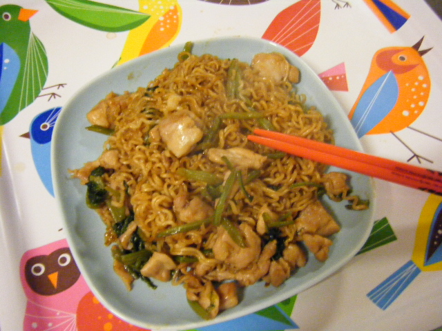 さっそく夕飯に焼きそばを作ってみました。作りかたは日本で売っている日清焼そばとまったく同じ。昨日解体した鶏もも肉と、マルクトで買ったばかりのほうれんそうを投入ー。