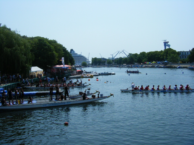 ヴァルノウ川では、ボートレースが行われていた。下流から上流に向かって、一生懸命ボートを漕ぐ人々。その場にいた人の話によると、参加者は1000人を超えるのだそう。「WISMAR」って書かれたチームTシャツ着ているひともいたし、遠方からここまで駆けつけて参加しているのかな?