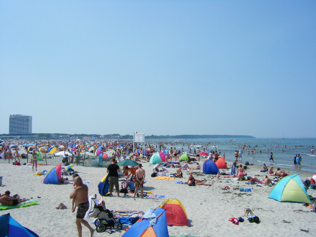 こうも人がたくさんだと、バルト海名物・籠椅子を並べる余裕もないかな。(籠椅子を借りて本でも読むといいわよ、と勧められましたが、こうも暑い&こうも人が多いと、ちょっとツライかも……)