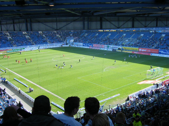 ドイツ人は基本的にわたしよりもかなーり背が高いので、思い切って最後列に行きました。うん、選手が豆粒クラスにはなっているけれど、フィールド一面見渡せるし、よさそう!幸い、周辺にいたひとたちも熱烈なサポーターではなかったので、割とゆったりと観戦することができました。