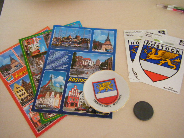 そうそう、ポストカードほしかったんだよね。おお、ロストックの紋章シールもある!おばさんが集めていたし、せっかくだから買っていきましょう。