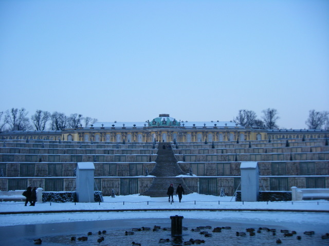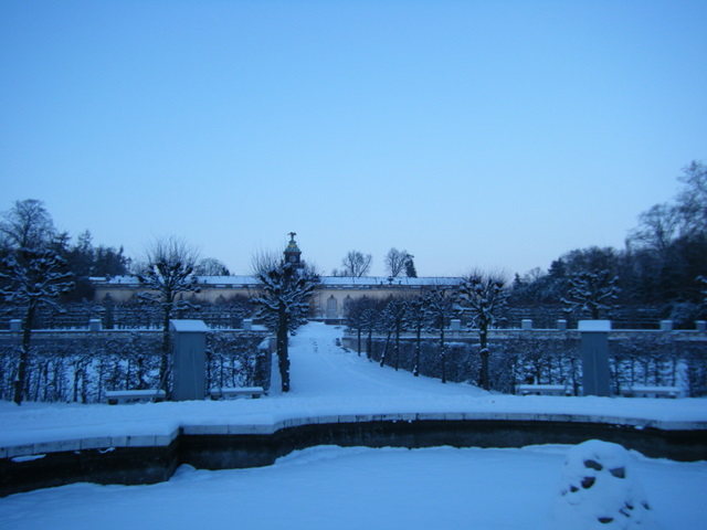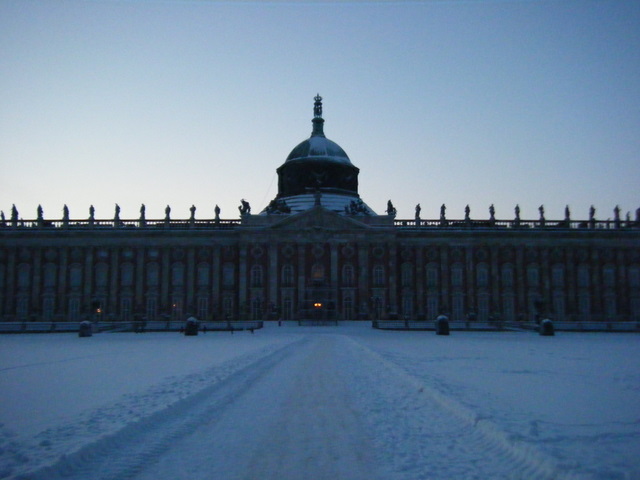 冬のサンスーシはとてもさみしいところと聞いていましたが、今日は天気がよかったせいか人出も多く、だいぶにぎやかでした。しかし新宮殿にたどり着いたころにはどっぷり日も暮れて、