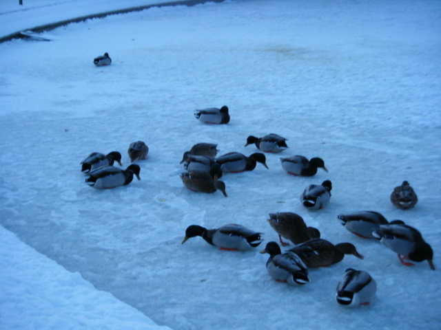 かもさんたちは凍った池(もどき)の上で各々のんびりと過ごしております。君たち寒くないのかい?