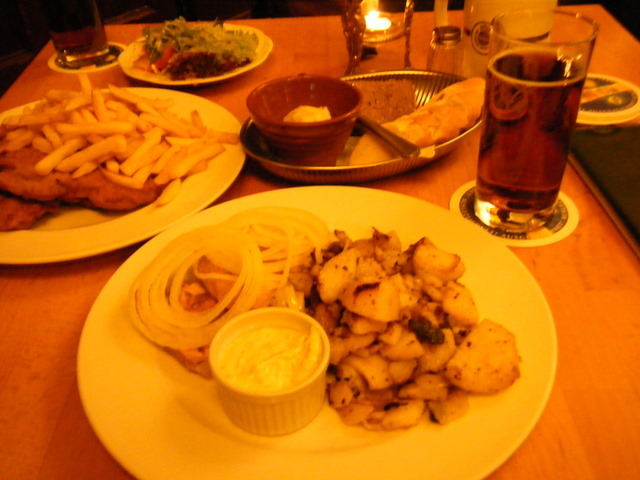 わたしが頼んだのはEisbeinsülzeというアイスバイン(豚肉の煮込み)のゼリー寄せ+焼きジャガイモ。調子に乗ってジャガイモをぱくぱく食べていたら、ゼリー寄せで断念。これもよく見えないですけど、実は3枚あります。一人前の量じゃない!おっそろしくコストパフォーマンスのよい店。