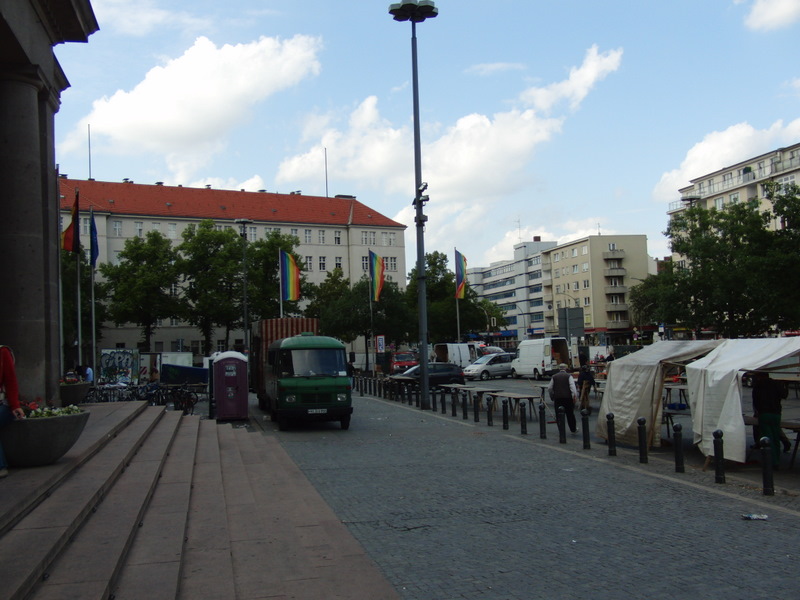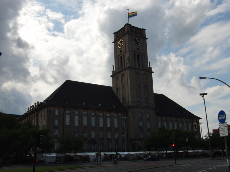 どうやら、今日がChristophers Street Day(プライド・パレード)の日であるのと無関係ではないらしい。また、シェーネベルクは同性愛者が多く集まる地区とも言われている……らしい。ほかの市庁舎の旗も7色なのかしら。それとも、シェーネベルクだから?